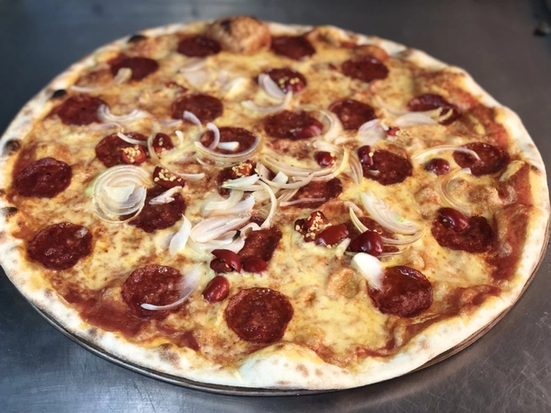 tomat, mozzarella, salám, slanina, šunka, vejce, chilli omáčka
